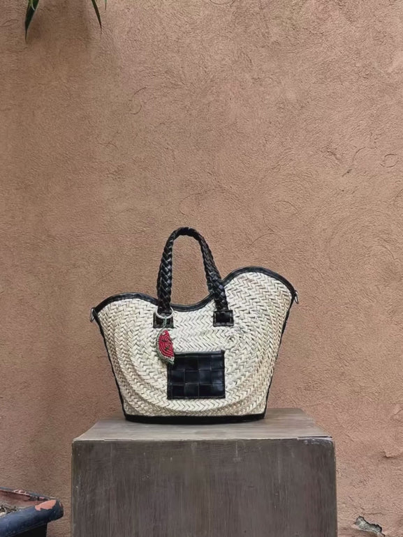Piles of lemons and oranges, summer watermelons cut into slices, shiny tomatoes, bright green avocados and bunches of grapes in woven baskets — these everyday scenes shaped the collection. A postcard from Marrakesh turned into raffia charms and keychains, made to travel with you.
